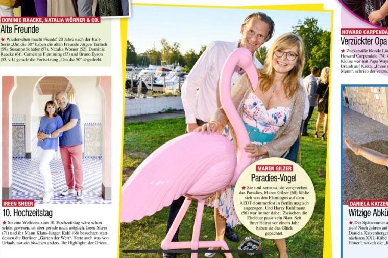 Freude über schöne Berichterstattung . Die Skulpturen Ausstellung der Designerin Claudia Bias war ein voller Erfolg und zahlreiche Prominenten Besucher des AEDT Sommerfestes ließen sich mit den bunten Hinguckern fotografieren.